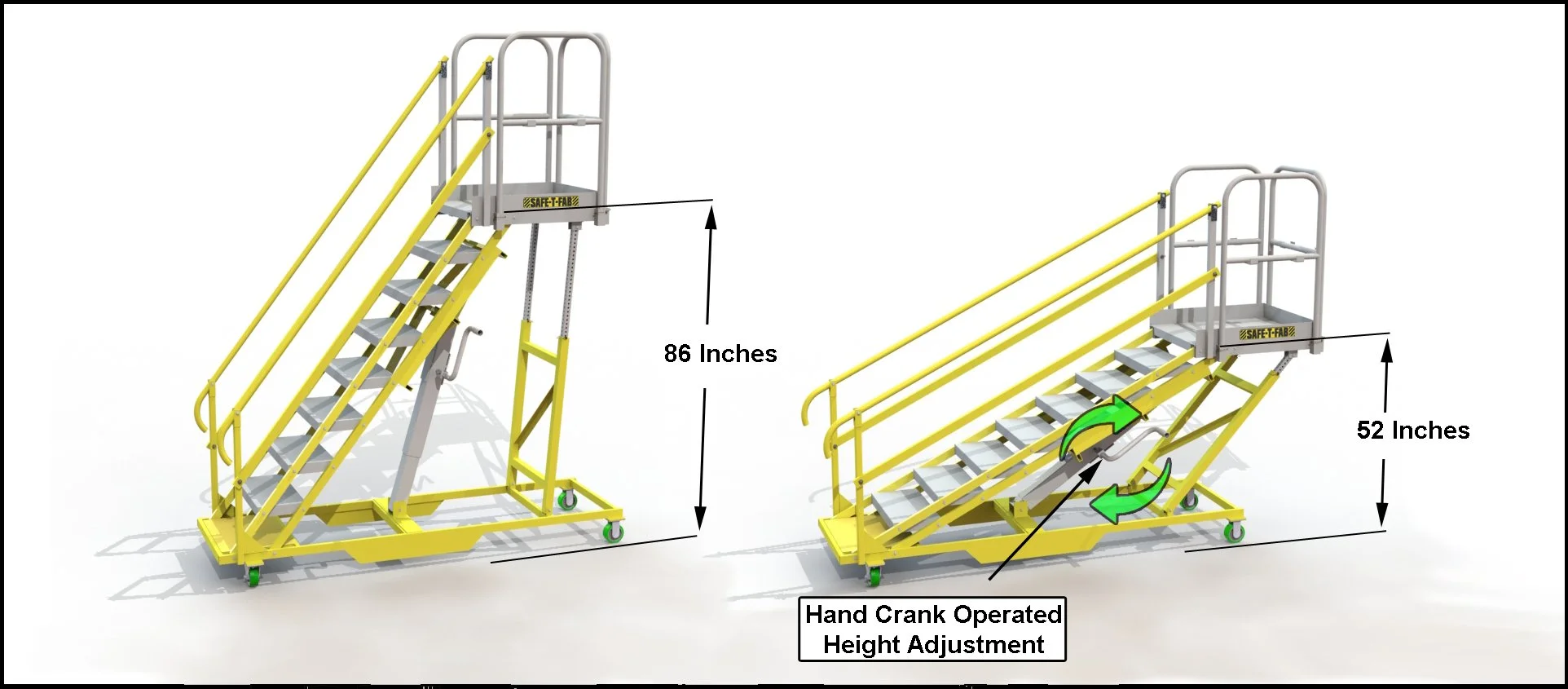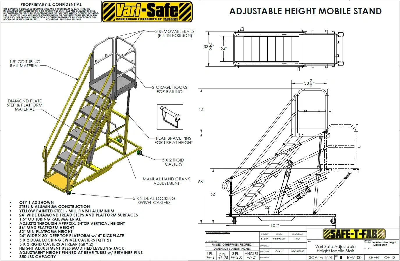 If the base model specs shown above don’t fit your exact need, customers can easily dial in their adjustment window (34” max adjustment window)to fit their exact application needs by clicking the Get a Quote button below. Our Vari-Safe line is configurable—options include wider step widths up to 36 inches and alternative surfaces such as grip strut for maximum traction. Whatever the requirement, we tailor the platform to deliver the right balance of safety, mobility, and productivity